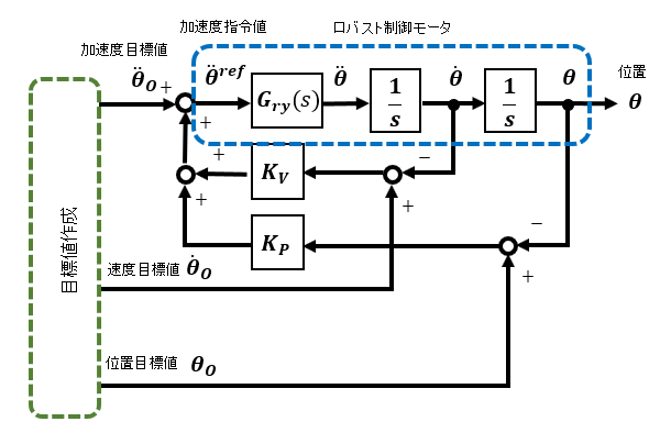 上式が成立するのは速度系にロバスト制御が施されていて速度指令値θ'ref ≒ 速度θ' となることにより加速度指令値θ"ref ≒ 加速度θ" とみなせるからです。