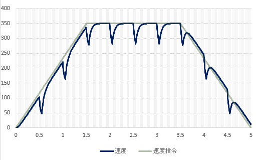 ステップ応答時と同じ条件で速度指令値を台形パターンにしたものです。補償器の条件は比例ゲインを0.5, 積分ゲインを15にしたものです。