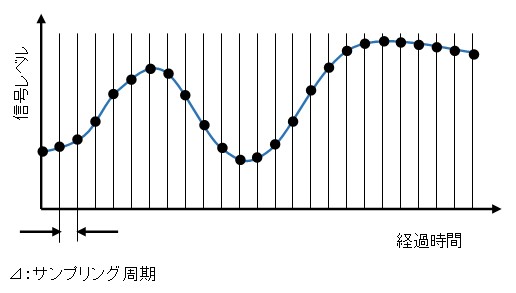 アナログ信号からデジタル信号をつくるためにはAD(Analog-Digital)変換を通して数値を時間軸で刻んでサンプリング(標本化ともいう)し、信号の大きさ(信号の振幅)を離散的な数値に刻むことを量子化といいます。