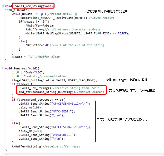 上述のPCのターミナルソフトからの操作を Nucleo(STM32) に置き換えたESP32とマイコン間での通信をする場合のアプリを紹介します。あらかじめ、登録しておいたコード"ABC"と受信コードが一致・不一致で処理を分けるアプリです。 受信コードを含む文字列は終端が分かるように入力コードには"@"を最後に含めています。