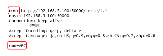 上記コードはGETメソッドでURLが192.168.3.100:50000へのアクセスリクエストです。 URLにはアクセスしたいファイルのパス名まで入れることもありますが、省略したときはトップページのHTMLを要求していることになります。