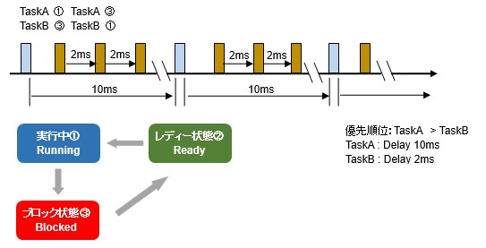 待ち時間5msが経過するとTaskAは最優先度ですので再び実行します。つまり、約5msの周期で処理Aが一度だけ行われます。