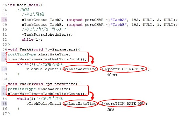 実行周期を正確に設定したい場合はvTaskDelayUntil関数を使用します。サンプル図のような構成で、xTaskGetTickCount関数で前回のタスク起動時間を取得してvTaskDelayUntil関数に渡しています。